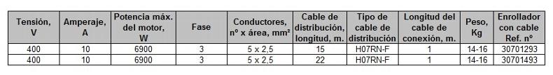 - Enrolladores de cable para trabajos pesados, para uso en entornos industriales. - Versión trifásica que incluye un protector térmico de sobrecarga. - Puede contener hasta 25 m. de cable. - Los componentes están hechos de materiales compuestos y acero galvanizado. - Cable eléctrico de goma. - Grado de protección: IP55 - Probado y certificado según IEC 61316